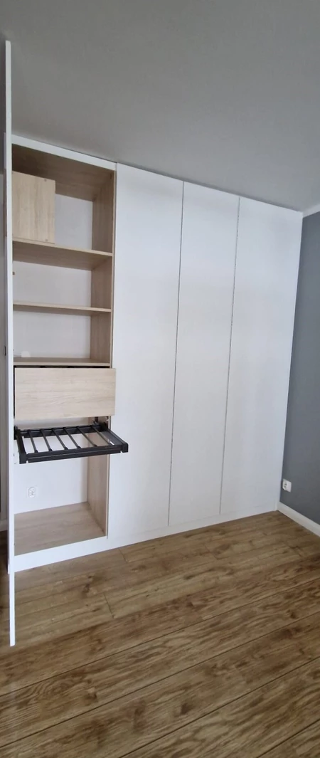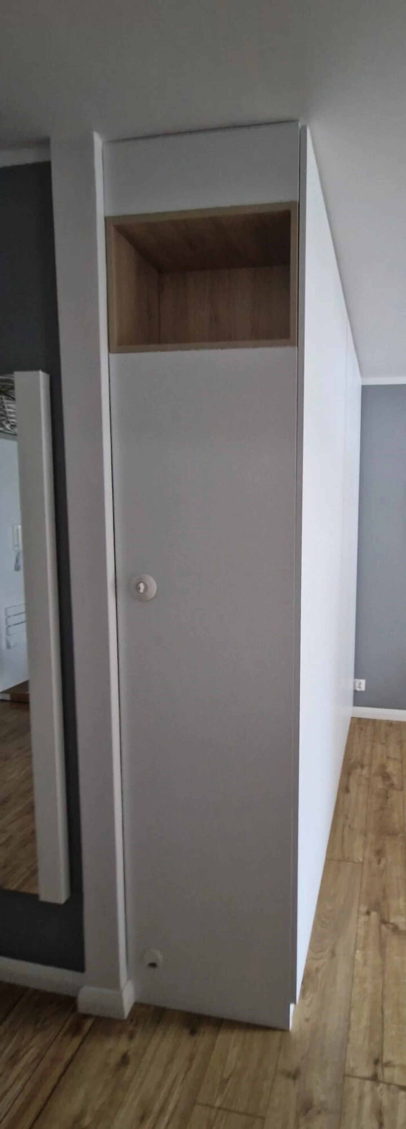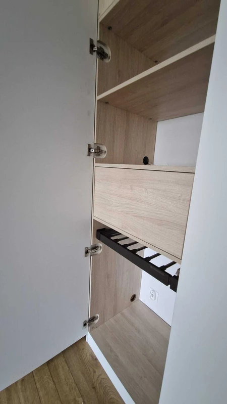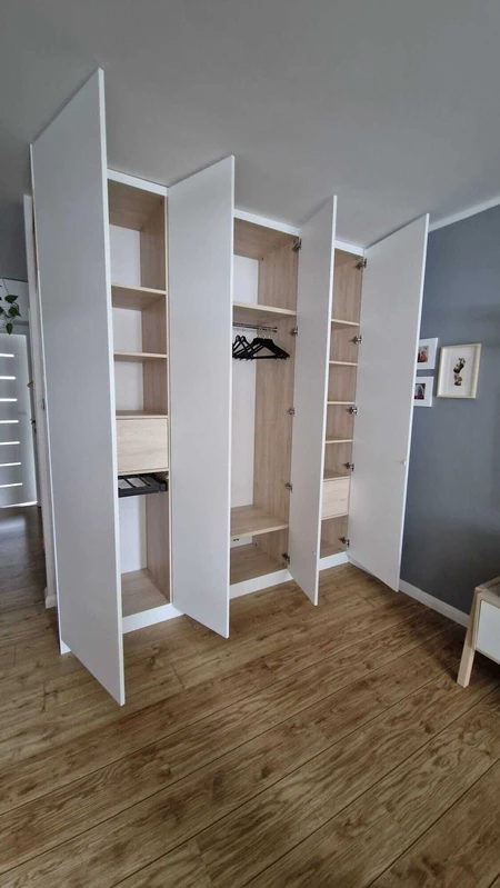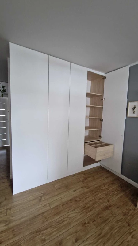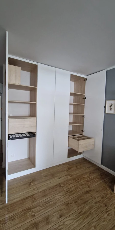 Pojemna i klasyczna szafa na wymiar. Fronty wykonane z białej płyty akrylowej harmonijnie kontrastują z jasnym, drewnopodobnym wnętrzem. Przemyślana organizacja przestrzeni z półkami, szufladami i drążkiem na wieszaki zapewnia wygodne przechowywanie odzieży i akcesoriów.