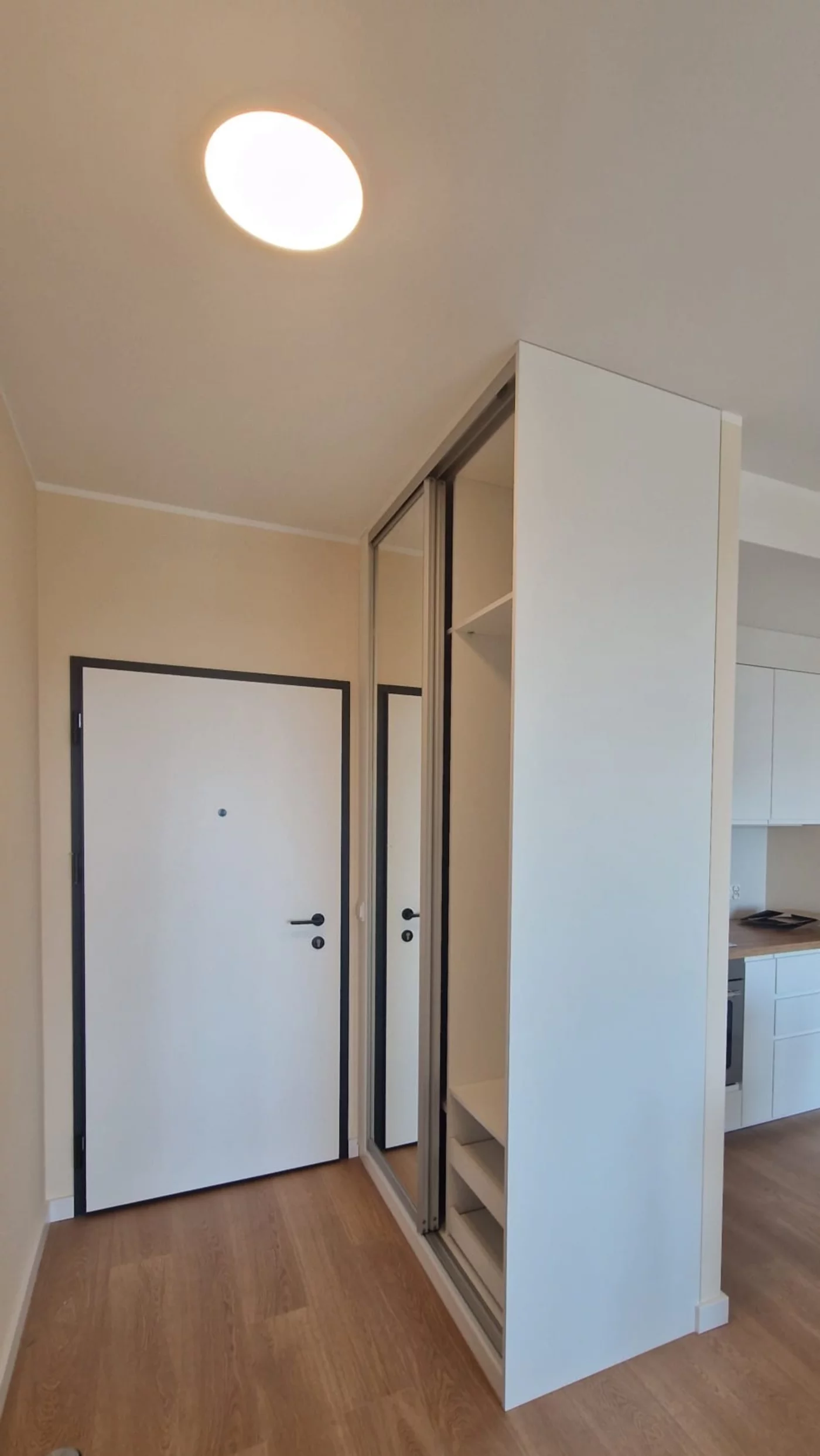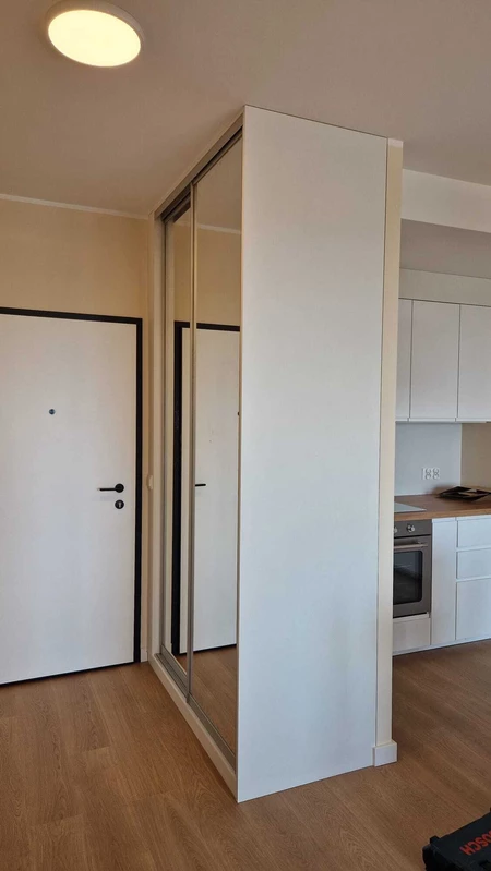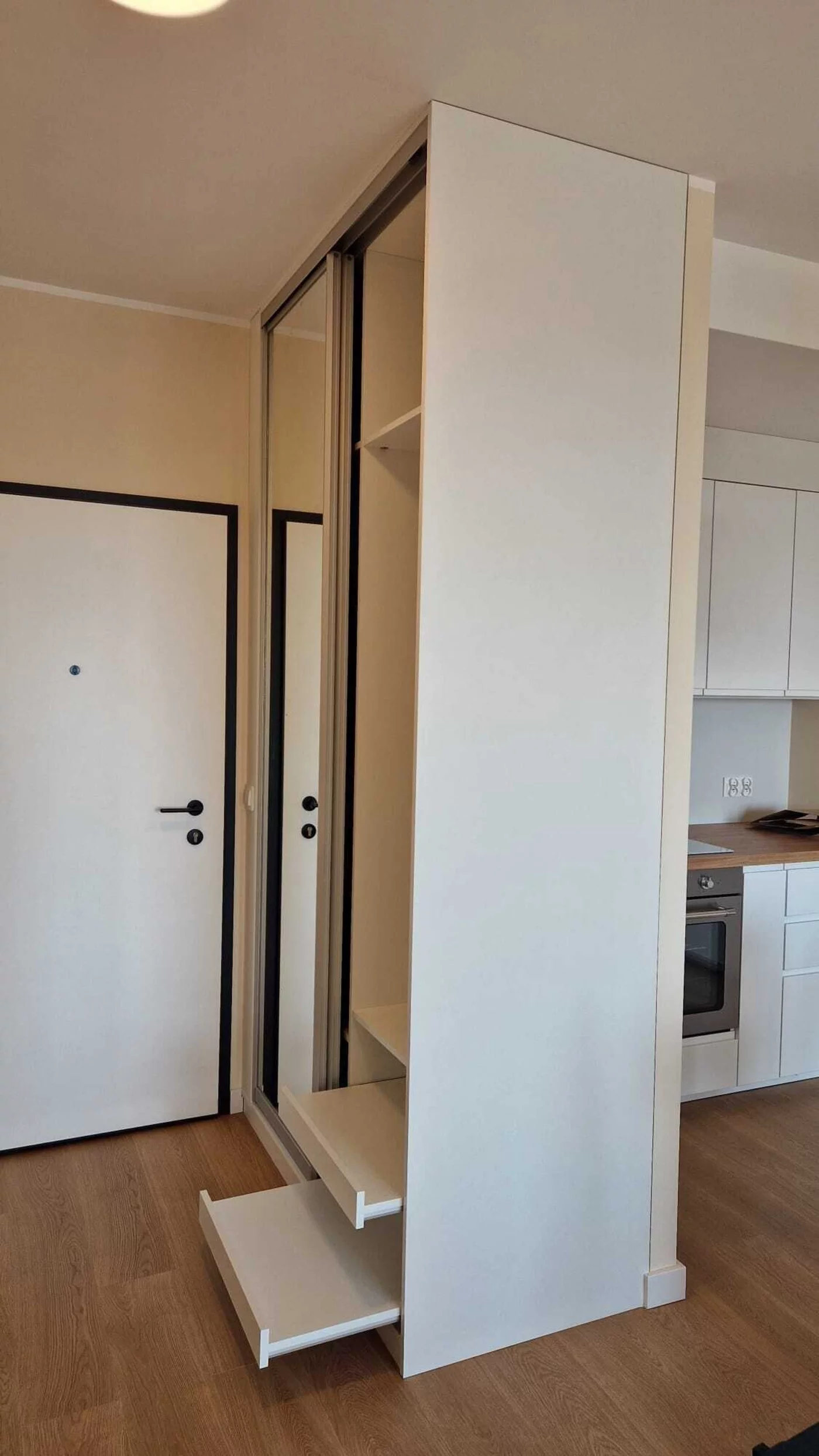 Funkcjonalna szafa zaprojektowana z myślą o maksymalnym wykorzystaniu przestrzeni. Wyposażona w przesuwne drzwi z dużą taflą lustra, które optycznie powiększają wnętrze. Minimalistyczny, biały korpus doskonale komponuje się z nowoczesnymi aranżacjami przedpokoju i sąsiadującej z nim kuchni.